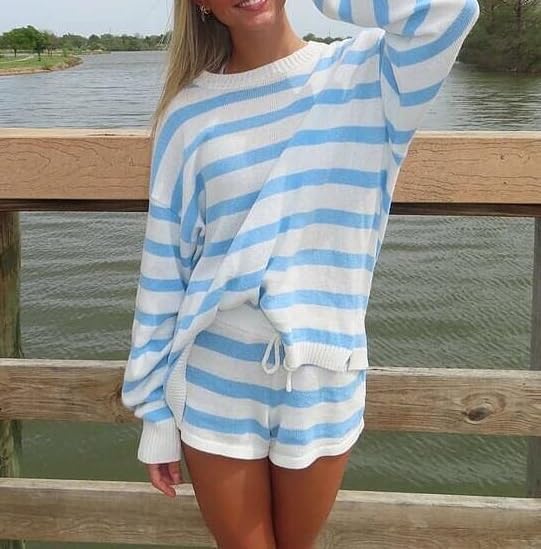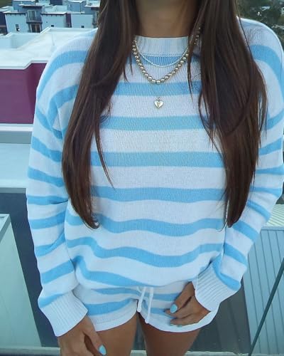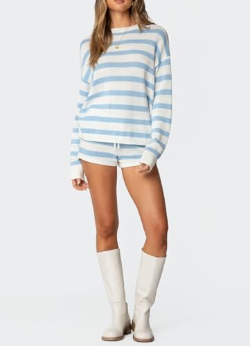 Material: Polyester blend. Striped 2 piece sweater set for women, knitted lounge outfits, skin friendly, lightweight, breathable, good stretchy and comfortable to wear Feature: Striped sweater shorts set, matching lounge set for women, oversized sweater outfits, color block knitted set, loose fit, crewneck, drop shoulder, knit pullover sweater, drawstring high waist knit shorts Style: Two piece sweater shorts set, this 2 piece striped matching set is crafted with a slouchy sweater top and knit shorts for women, wear as matching pajama outfits, loungewear sets or going out knit shorts set Occasion: Y2k striped matching shorts lounge set suitable for casual daily wear, leisure, vacations, hang out, workout,yoga, school, loungewear, going out, office, travel, beach, dates, and more Package: 1* Long sleeve sweater top and 1* Wide leg knit shorts