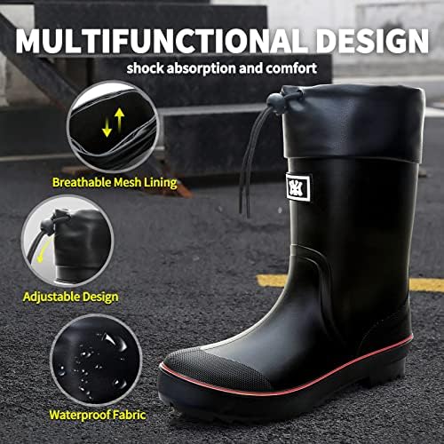 【Lightweight & Multi-Use】Our contoured mid-sole allows for lightweight cushioning, shock absorption and comfort. Rain boots keep you dry and warm, and handle even the toughest work and sports situation.The bootlace with elastic band and which are convenient for users to put on or take off, shaft provides you with more protection and durability. 【Unique Design】Rain boots men have a comfor and flexible design with thickened rubber sole, soft insole and breathable mesh. Not only having excellent air circulation and strong thermal insulation effect, but adjustable elastic band and waterproof fabric are designed at the boot mouth for easy wearing, also keeping your feet dry and comfortable after a long day at work. 【Protective Outsole & Anti-Slip】Garden working boots shank slip-resistant lug outsole gives excellent stability & extra solid traction on wet surface.The lightweight rubber mid-sole provides strong support for your feet, and the deep pattern design can effectively reduce vibration or shock when walking, providing excellent stability on uneven terrain. 【100% Waterproof】It's important to maintain dry feet especially in cold temperature. Our high grade natural rubber material which extends up above the ankle for protection from water and objects, providing extra durability and 100% waterproof. With a pair of four-season rain boots, you can do whatever you want outdoors. 【Seamless Technology】: Our rain boots use PVC polyblend injection molded construction technology, which is seamless, up to 30% lighter, and 100% waterproof. Light weight, provide resist to various liquids and sharp objects, super waterproof and anti-friction performance. Whether you are fishing, working, hunting, camping, dog-walking or playing outside.