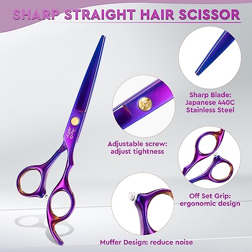 JASON Hair Scissors Professional - 10 PCS Haircut Scissors Set, Thinning Shears for Hair Cutting with 30 Teeth, Straight Shears for Men Women Home Salon Barber (6.7", Purple)