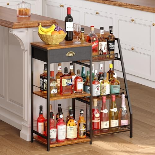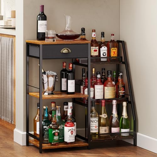 Jakyitvi Liquor Cabinet Bar for Home with Drawer, 3-Tier Wine Rack Freestanding Floor and Wine Shelf with Step Design for Whiskey, Spirits, Vintage Mini Bar for Kitchen Apartment