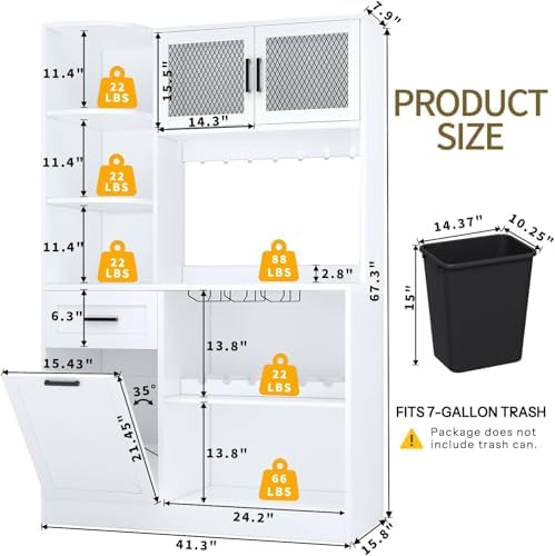 DynJest 67.3" Tall Modern Kitchen Pantry Storage Cabinet with Drawer and Shelves, Tilt Out Trash Can, Coffee Bar Wine Cabinet with LED Lights and Power Outlet, Wine Glass Rack, 2 Mesh Doors (White