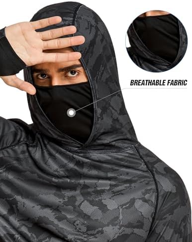 【Cooling Fabric】Our Long Sleeve Sun Protection Hooded Shirts are made of moisture-wicking fabric, the mesh panels at two sides enhanced ventilation, pulling moisture away rapidly from the skin and keeping you dry and comfortable all day. 【UPF 50+ Sun Protection】These Sun Protection Clothing gives you UPF protection to shield your skin and neck from harmful UVA/UVB rays. Our sun shirts block 99% more UV rays, keeping your sensitive skin safe in the summer. 【Thumbholes and Face Mask Design】This SPF Fishing Hoodie Shirt features thumbholes and a face mask cover. The thumb holes design keeps the sleeves in place and gives extra coverage for sun protection. The face mask keeps you away from dust and bugs. 【Hidden Zipper Pockets】The Camo Hooded Rash Guard Shirts have two big hidden side zipper pockets, which have enough capacity to put your personal belongings, such as your phone, wallet, etc. 【Occassions】This UPF 50+ Sun Protection Hoodie Shirt is lightweight, breathable, and stylish, it's perfect for summer outdoor activities, fishing, hiking, cycling, workout, camping, beach vacation, and daily wear, etc.