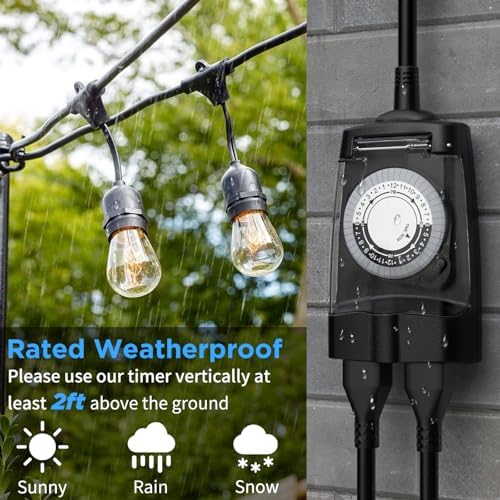 G-ELEK Outdoor Timer Waterproof, 24 Hour Light Timer, Timers for Electrical Outlets, Ideal for Pool Pump, Christmas Lights, Heavy Duty, 2 Grounded Outlets, ETL Listed, Black