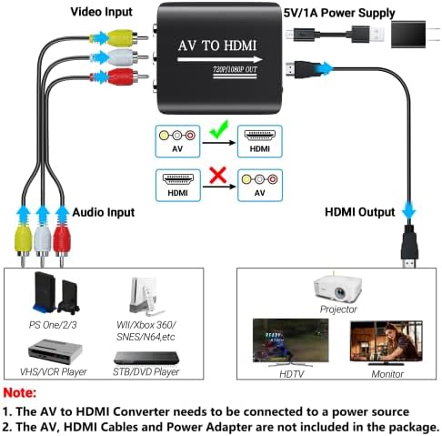 GINGIN AV to HDMI Converter, AV to HDMI Adapter Support 720p\/1080p for PS1\/PS2\/PS3\/Xbox 360\/WII\/N64\/SNES\/STB\/VHS\/VCR\/Blue-Ray DVD Players