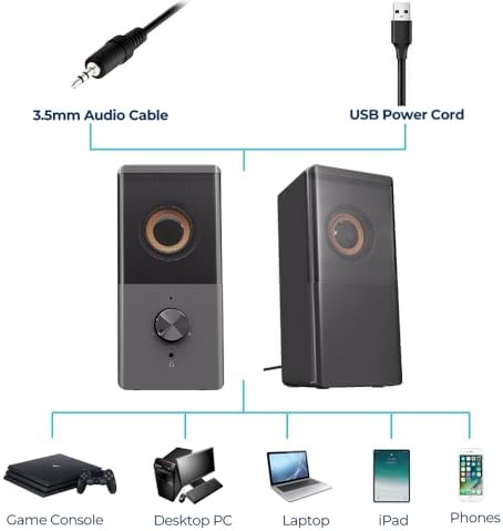 ROSON Computer Speaker, Compact Size Speaker with Headphone Jack, Enhanced Bass and Volume Control, Stereo 2.0 USB Powered 3.5mm Aux Multimedia Speakers for Laptop\/Desktop\/Tablets\/Phone