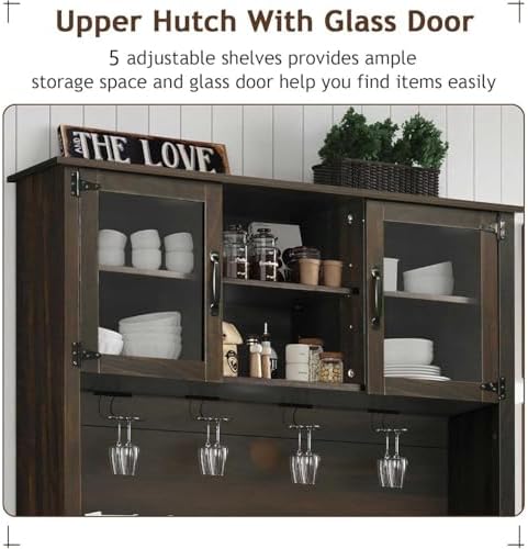 4ever2buy 72" Farmhouse Coffee Bar Cabinet with 2 Glass Doors & 9 Wine Racks, Tall Hutch Cabinet with Storage, Wine Bar with 4 Row Metal Glass Holder, Dark Oak