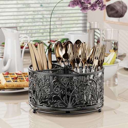 YIUKEA 360° Rotating Utensil Caddy - Silverware Cutlery Caddy Holder with 4 Compartment, Metal Flatware Organizer Countertop with Handle for Party Camping Picnic, Kitchen Counter, Office (Black)