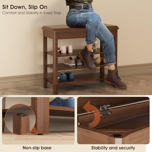 IUNVR Shoe Rack Bench Seat Rubberwood 3-Tier Wooden Storage Bench 550lbs Compact Mid-Century Modern Design for Entryway, Hallway, Closet, Front Door Entrance, Foyer