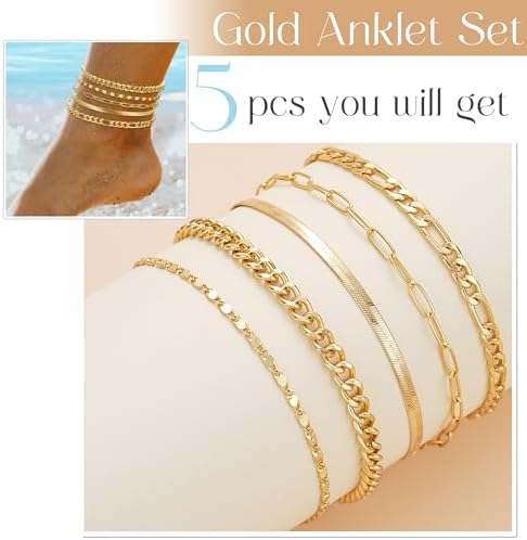 iF YOU Gold Ankle Bracelets for Women, 14k Gold Plated Waterproof Cuban Link Chain Anklets Set, Layered Anklet Bracelets for Women Beach Gift Adjustable Size 5pc