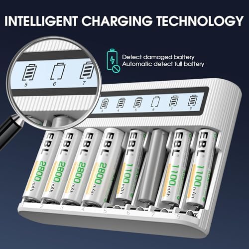 EBL 8 Bay Battery Charger with LCD Screen Fast Charging, AA AAA Battery Charger with 2800mAh NiMH AA Batteries 4pcs & 1100mAh AAA Battery 4pcs Combo