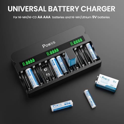POWXS rechargeable AA AAA 9V battery charger, 1800mA high-speed, 12 slot independent battery charger, suitable for 1.2V nickel hydrogen nickel cadmium AA AAA rechargeable batteries and 9V lithium-ion