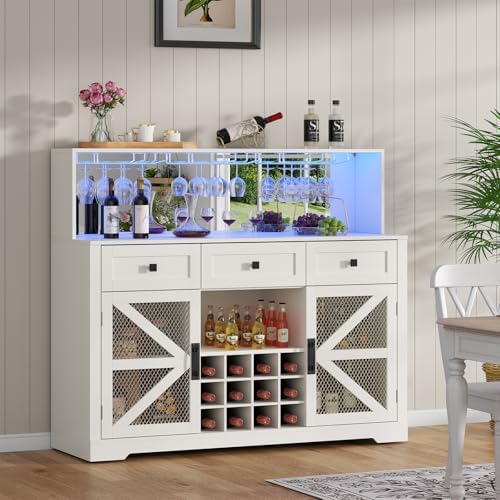 Gyfimoie Farmhouse Wine Bar Cabinet with LED Lights, Kitchen Coffee Bar Cabinet with Acrylic Mirror, Wine & Glass Rack, Storage Shelves and 3 Drawers (Signle Hutch)
