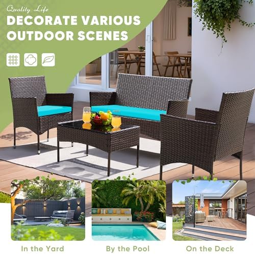 Greesum Patio Furniture 4 Pieces Conversation Sets Outdoor Wicker Rattan Chairs Garden Backyard Balcony Porch Poolside loveseat with Soft Cushion and Glass Table, Brown and Blue