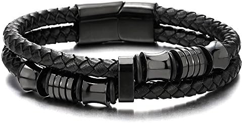 COOLSTEELANDBEYOND Mens Double-Row Braided Leather Bracelet Bangle Wristband with Stainless Steel Ornaments