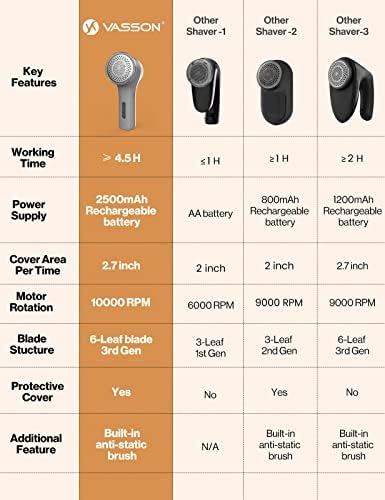 VASSON Fabric Shaver, Sweater Shavers to Remove Pilling, High-Perf Defuzzer, Rechargeable Electric Lint Shaver for Fuzz and Lint Balls from Clothing, Upholstery (Greyish White)