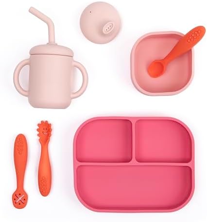 Bella Tunno Little Bites Bundle \u2013 Baby Feeding Set and Baby Led Weaning Supplies with 1 Baby Bowl, 1 Baby Plate, 3 Baby Utensils, 1 Cup, 2 Lids, 100% Food-Grade Silicone (Garden Party)