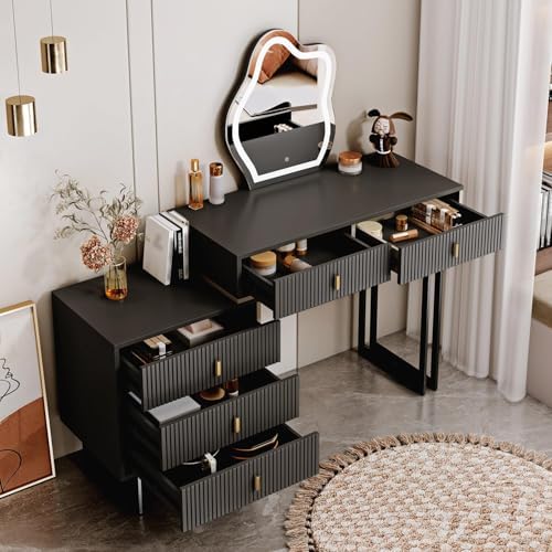 Ieejdn Black Vanity Desk with Mirror and Lights,Small Makeup Vanity with 5 Drawers, Modem Makeup Table with Adjustable Cabinet for Bedroom,Makeup Room