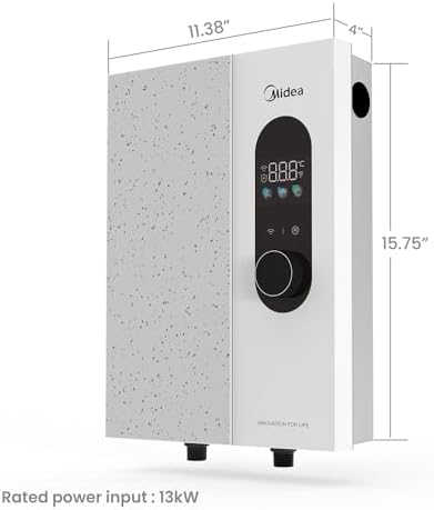 Midea 13KW Electric Tankless Water Heater, Touch Control, Wi-Fi Control, LED Display, Child Mode, 240 Volts with Automatic Power Modulation, On-demand Hot Water, White