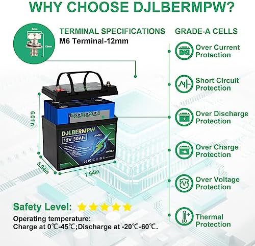 DJLBERMPW 12V 30Ah Lithium Battery 12V LiFePO4 Batteries 384W Load Power 4000+ Deep Cycle Lithium Iron Phosphate Battery Built-in 30A BMS Power Wheels Batteries for RV,Fish Finder,Emergency Light