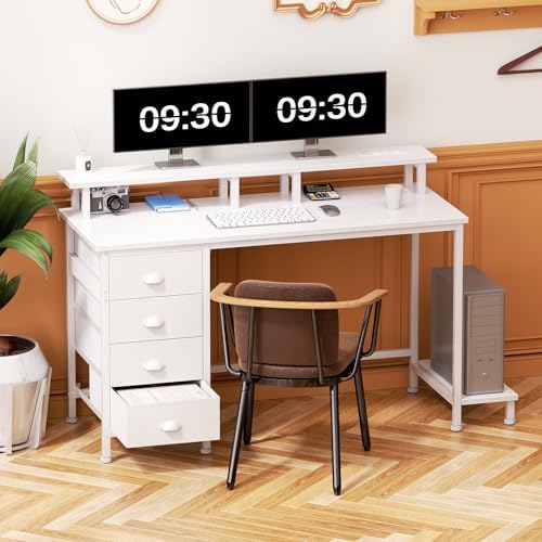 Furologee 47" White Computer Desk with 4 Fabric Drawers & Monitor Stand, Gaming Desk with Power Outlets - LED Lights, Home Office Space-Saving Study Table for Bedroom Small Spaces