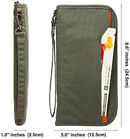 PLENTY ROOM -- L8.7*W 5.6* H1.0 inch, Weight : 150g / 0.33 LB. Passport holder have 2 passport pouch, 1 boarding pass pocket, 1 pen holder, 2 zipper bags, 6 card slots, 1 mesh bag, 1 keychain (removable) RFID BLOCKING PROTECT -- Safe your privacy and protect your personal information with NO-Skimming unauthorized scan under frequence 13.56 Mhz DURABLE QUALITY -- Constructed of High-Density Nylon fabric, Stone-Wash, Water-Proof EASY ORGANIZATION -- Plenty space for storing your travel essentials such as passport, boarding pass, tickets, invoice, pen, checkbook, money, coin, keys and shipping documents VERSATILELY -- Use removable Wristlet could easy carry-on with you and removable keychain also does the job for your convenience