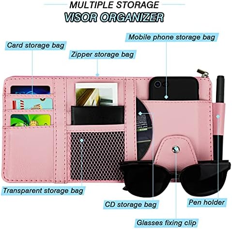 Car Sun Visor Organizer, Leather Pocket Organizer Sunglass Holder for Car Interior Accessories with Multi-Pocket Net Zipper (Pink)