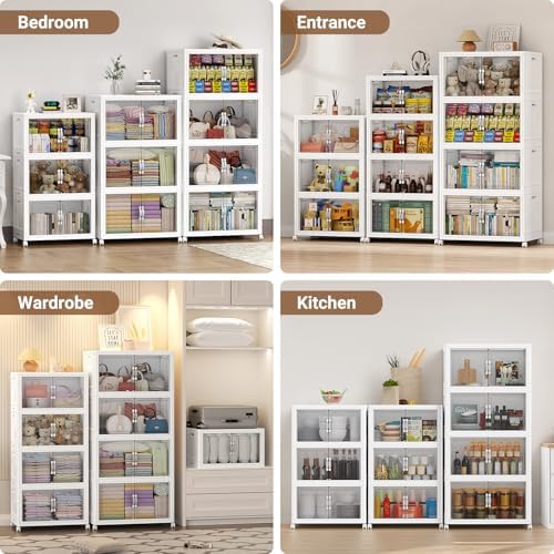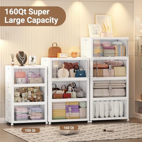 BROVIEW 640QT Extra Large Stackable Storage Bins, 160Gal Clear Plastic Closet Organizer Cabinet with Lid and Wheels, Collapsible Latch Boxes Folding Drawer with Door for Home Kitchen, V20 4Pack White