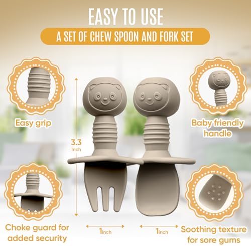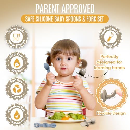 HippoBaby 4pc Silicone Baby Spoons Self Feeding Baby Utensils 6-12 Months - 3 Baby Spoon - 1 Baby Fork - Toddler Cutlery Set - BPA Free, Dishwasher Safe - Baby Eating Essentials (Gray\/Beige)