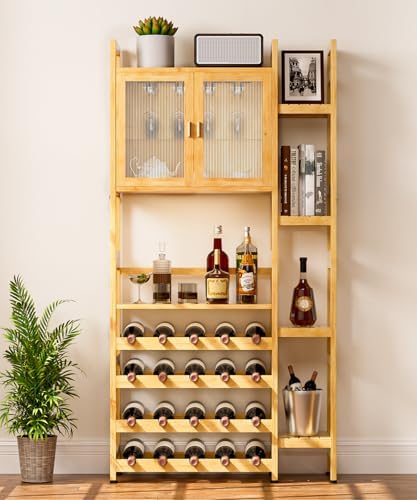 Cozivolife Wine Bar Cabinet,Wine Rack Floor Free with Doors Glass Holder,4 Tiers Wine Bottle Storage and Side 4-Layer Shelves for Living Room, Dining Room, Kitchen(Bamboo)
