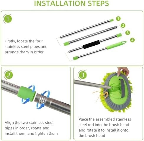 【62” Super-Long Pole Car Wash Brush】The car wash mop has 4 poles and you will amazingly find they can be assembled into 32”,47” or 62” by using 2, 3 and 4 poles. Hence adjustable length of this car brushes for washing greatly help you clean different height, protecting you from stretching bending or twisting to get everything done. 【2-in-1 Car Washing Brush】Assemble the chenille, turn it into a long mop, and clean the exterior of the car conveniently. When the pole of car brush is disassembled, the wall cleaning mop head can be used as a mitt, sponge, rag to make a super easy car cleaning. A soft and absorbent microfiber chenille head, which is scratch-free and gentle on the car's surface. It effectively picks up dirt and grime without leaving any scratches behind. 【Sturdy Connection-design】The design of the spiral link is no worry that the car wash brush with long handle will be retracted or stretched to make the truck washing equipment rod stable and firm, no scratch your car or make you lose the patience to wash cars.180°mop head rotation & anti-slip handle of car cleaning brush can easily control the truck wash brush and adjust the angle to make cleaning more convenient. 【Scratch-Free Microfiber Wash Car Brush Head】Car wash sponge mop head works in a way that it collects the particles of grime and dirt by trapping them into the washing mitt fibers. This mop head is soft, absorbent, lint-free, swirl-free and scratch free, it is also safe on paint and other delicate surfaces, especially safety for car surface. Long life,Reusable and washable. 【Multifunctional Windshield Squeegee】After finishing a comfortable bath for cars, it is time to use car window windshield squeegee to scrape foam-water as a breeze with soft rubber blade. Fast and streak-free drying to maintain a gorgeous shine on your car. The car wash squeegee fitted with poles is also great for window, glass, door, mirror at home. 【Wide Application】This car cleaning supplies kit offers a convenient and effective solution for maintaining the cleanliness of your vehicle.This is perfect helper for washing, drying, waxing, dusting and polishing your vehicles or household.Not only can you wash a car,truck,suv, motorcycle, rv, but it’s awesome for windows, dusting, ceiling fans, sheds, kids slides/ outdoor structures and your home accessories!
