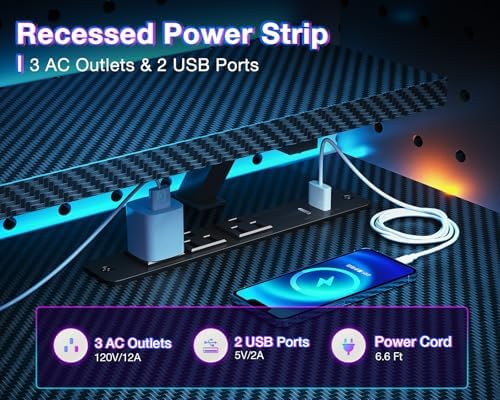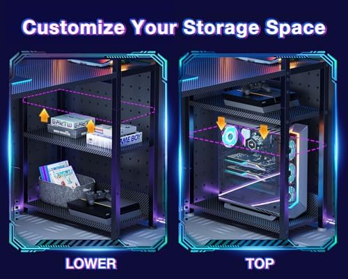 ODK Reversible Gaming Desk with USB Charging Port and LED Lights, 40 Inch Computer Desk with Storage Shelves & Monitor Stand, Study Table for Home Office, Small Space Bedroom, Carbon Fiber Black