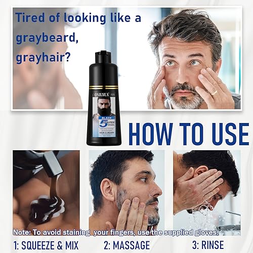 Men's Long-Lasting Black Hair Dye & Root Touch Up for Gray Coverage - 5 Minute Natural Beard & Mustache Coloring Shampoo 3-in-1