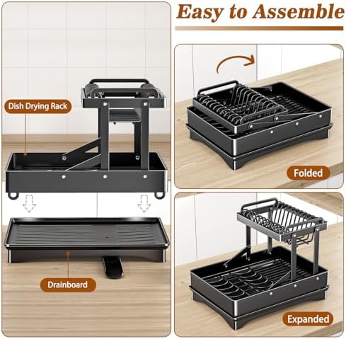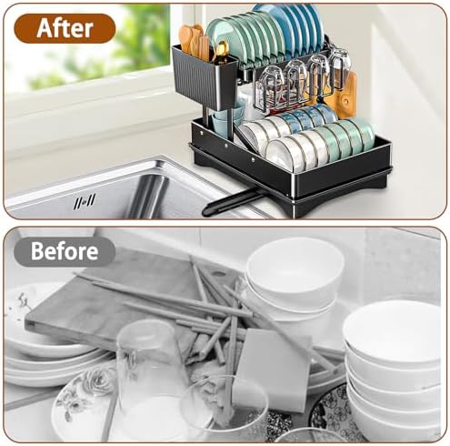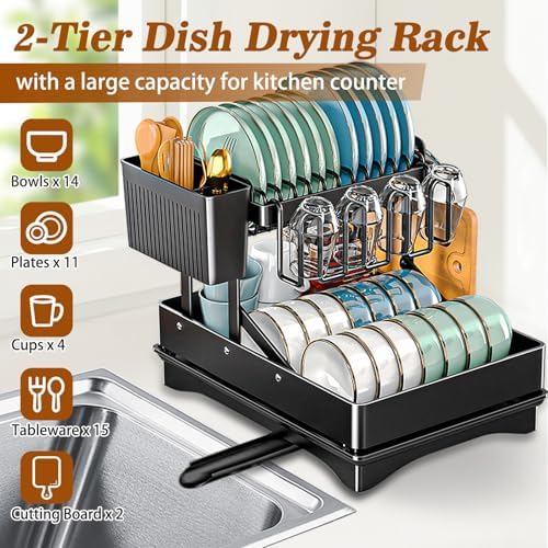 BYTANA Rust-Proof Dish Drying Rack, 2 Tier Large Dish Rack for Kitchen Counter, Carbon Steel Detachable Dish Drainer Organizer with Utensil Holder and Drainboard 16.5 x 11.8 x 11.6 in, Black