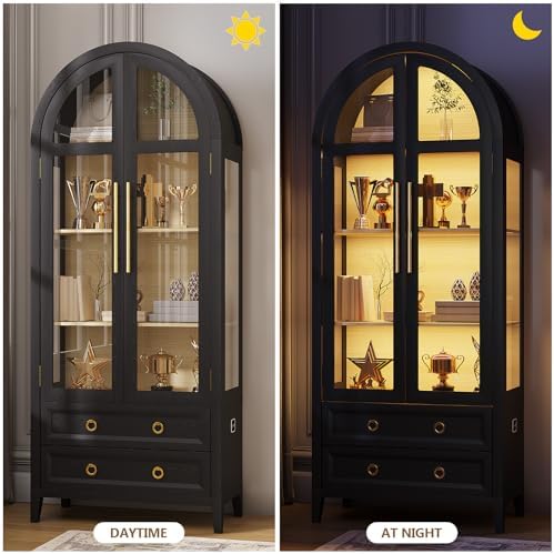 LVSOMT 71" Tall Arched Storage Cabinet with Glass Doors and Drawers, Curio Display Cabinet with Adjustable LED Light & Human Sensor, 4-Tier China Cabinet for Living Room(Black+Wood)